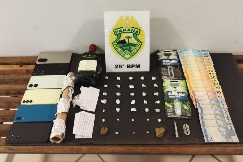 Durante as buscas, a PM apreendeu 33 pedras de crack já fracionadas, duas porções de maconha, R$ 652 em dinheiro trocado, escondidos dentro de um tênis, além da garrafa de whisky, lâminas de barbear novas e seis aparelhos celulares sem comprovação de procedência. Também foram localizadas anotações relacionadas à contabilidade do tráfico e materiais utilizados para embalar drogas.