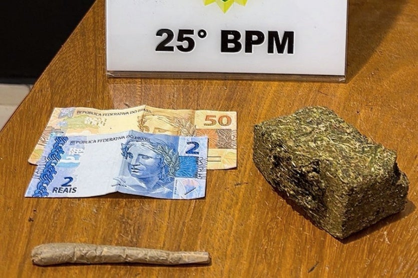Ao chegar ao local, a equipe encontrou o veículo estacionado em frente à residência, com o motor ligado e o suspeito em seu interior. Durante a abordagem e revista veicular, os PMs localizaram uma porção de maconha, já embalada para venda, além de dinheiro em espécie.