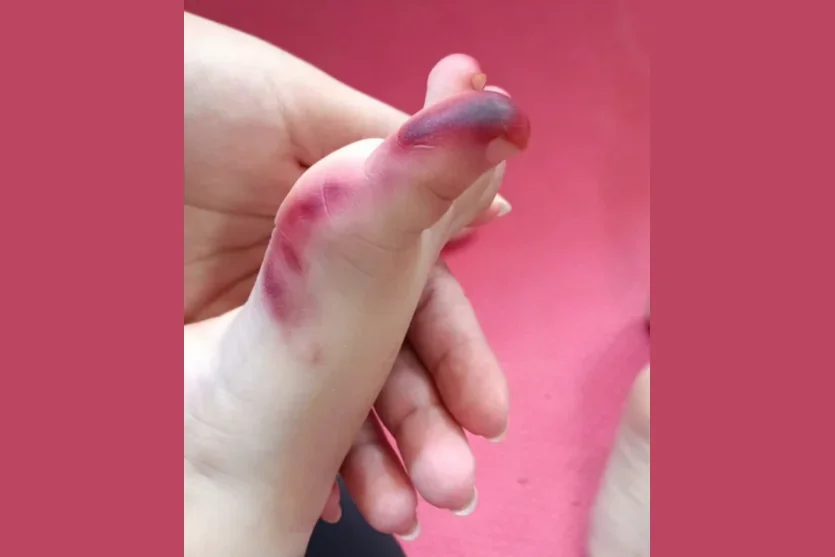 Ao verificar, a educadora encontrou o animal esmagado dentro do tênis. Além disso, o pé da criança apresentava alteração de coloração, como mostram as imagens registradas pela família. O susto, então, se tornou maior.