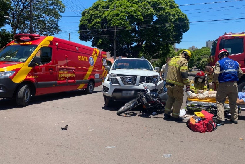 O sinistro envolveu uma caminhonete Nissan/Frontier, de cor branca, e uma motocicleta Honda CG/Titan 125cc, de cor preta. O condutor da moto trafegava pela avenida Pirapó, no sentido da avenida Apucarana para a Praça Portugal.