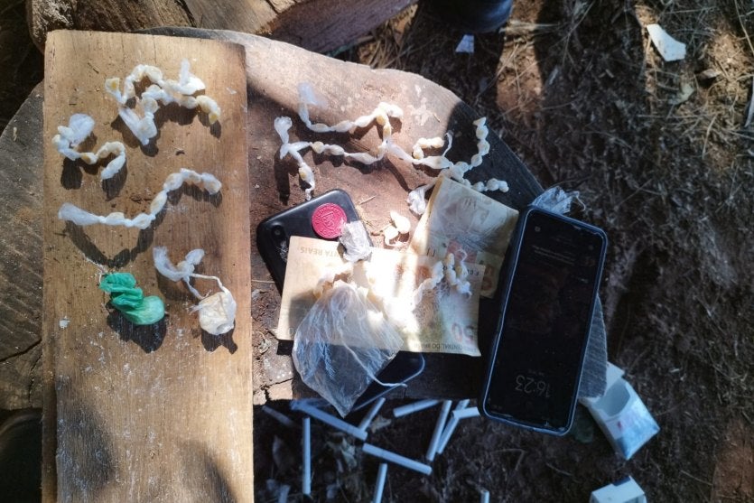 Ao constatar o crime, os policiais deram voz de abordagem aos envolvidos. Um dos suspeitos, identificado como gerente do ponto de venda, fugiu por uma área de mata e abandonou um aparelho celular. No local, foram detidos um homem apontado como usuário e apreendidos dois adolescentes, de 14 e 15 anos, que estavam sendo usados pelos suspeitos para comercializar as drogas.