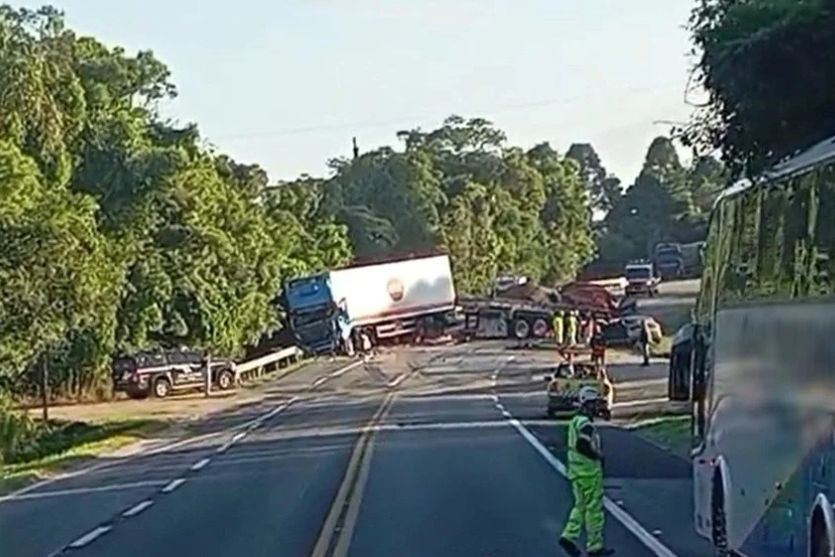 Três pessoas morreram e duas ficaram feridas em um grave acidente de trânsito envolvendo dois caminhões e dois carros de passeio na BR-476, em Contenda, na Região Metropolitana de Curitiba.