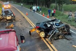 De acordo com o Corpo de Bombeiros Militar de Goiás, equipes do quartel de São Luís de Montes Belos foram acionadas por volta das 18h40 para atender a uma colisão frontal entre um carro de passeio e uma caminhonete, na zona rural do distrito de Novo Planalto.