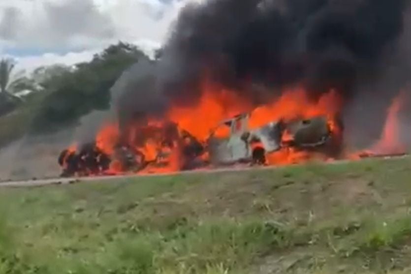 De acordo com a Polícia Rodoviária Federal (PRF), o acidente envolveu uma caminhonete do tipo pickup e um carro de passeio. Com a força do impacto, ambos os veículos pegaram fogo, e as chamas se espalharam rapidamente, provocando a interdição total da pista nos dois sentidos.