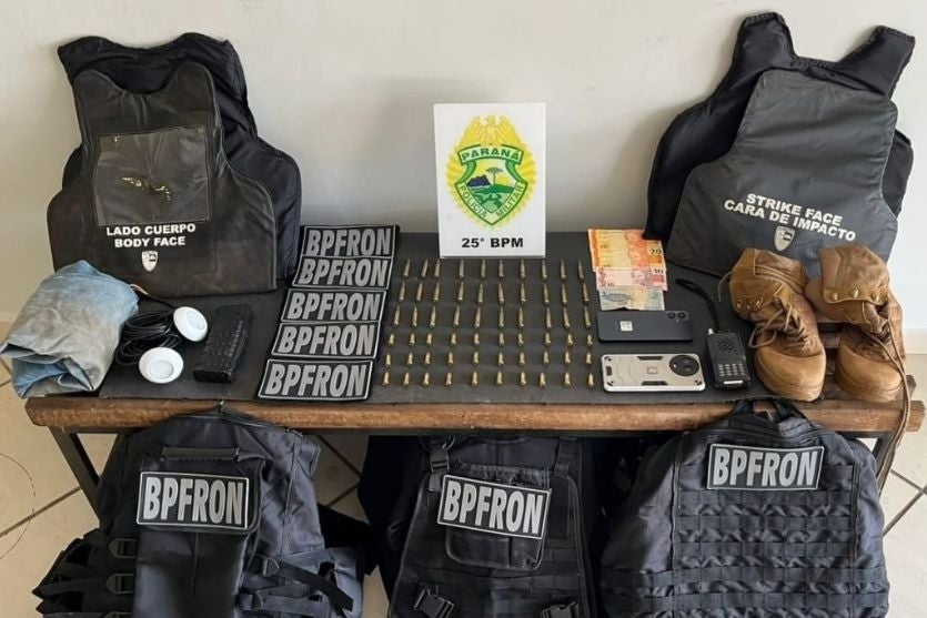 No local, foram apreendidos diversos materiais, entre eles munições de calibres restritos e de uso permitido, inclusive de origem estrangeira, um carregador de fuzil municiado, capas e placas de coletes balísticos, rádio comunicador, dispositivos luminosos semelhantes a giroflex, além de vestuário, acessórios táticos e objetos com identificação institucional indevida.