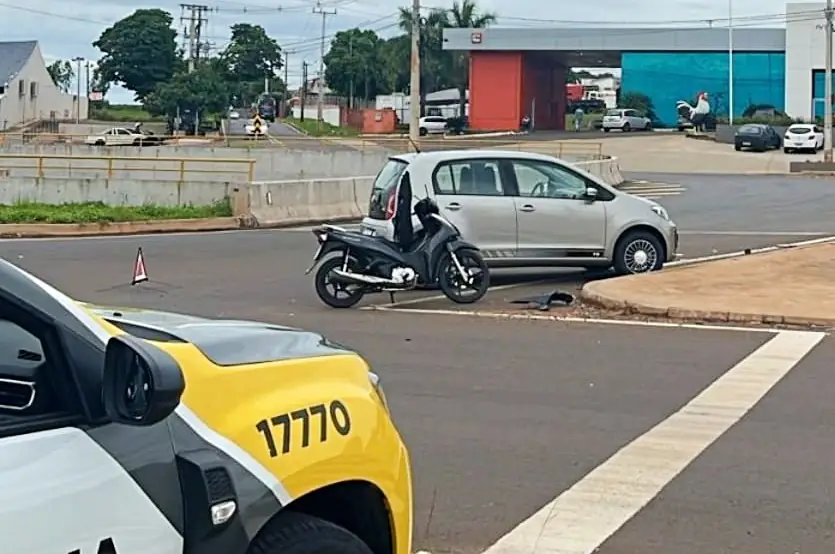 De acordo com a nota da PM, o abalroamento transversal envolveu um VW/Fusca 1300 (que não aparece na imagem acima) e uma motoneta Honda/Biz, de cor preta. A colisão ocorreu na interseção de vias do trevo do Posto Gauchão, entre a Avenida Doutor Ângelo Moreira da Fonseca e a rodovia PR-323.
