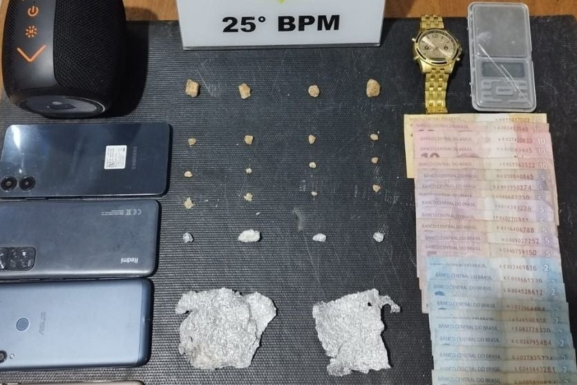 Além da droga, os policiais encontraram uma balança de precisão, duas lâminas, pedaços de papel alumínio utilizados para embalar o entorpecente, R$ 126 em dinheiro, quatro aparelhos celulares e uma caixa de som portátil. Também foram apreendidos objetos com indícios de serem produto de furto, como um relógio.