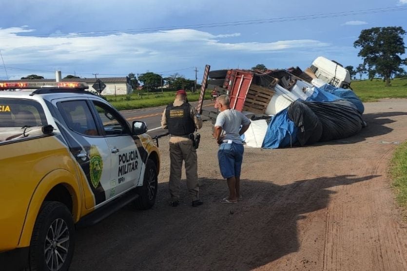 Um caminhão tombou no fim da tarde desta terça-feira (13) no km 222+500 da rodovia PR-323, no município de Cianorte (PR). Apesar do susto e dos danos materiais, ninguém ficou ferido.