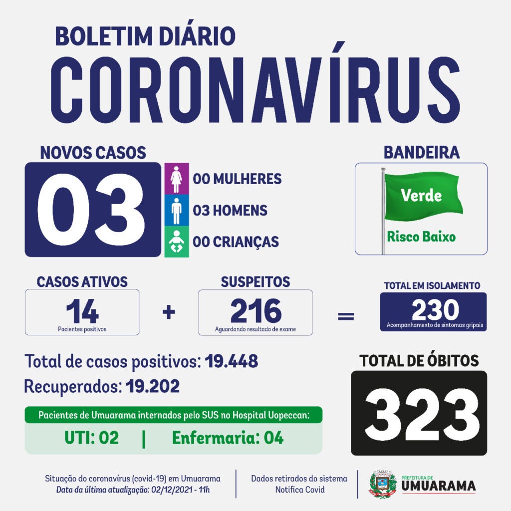 Nesta quinta-feira (2) a Secretaria de Saúde de Umuarama anunciou que três homens receberam exames com resultados positivos para o coronavírus. O Boletim Covid informa ainda que novamente nenhuma morte foi oficialmente confirmada, estando o total de óbitos em 323, em números contabilizados desde o início da pandemia, em março de 2020.
