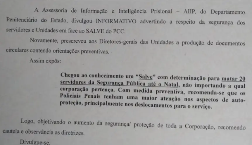 O documento afirma que chegou ao conhecimento do órgão que a organização criminosa teria ‘pedido’ 20 mortes de agentes de segurança pública até o Natal.