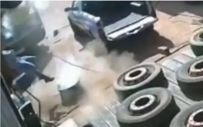 Em um vídeo divulgado nas redes sociais é possível ver o momento em que o pneu tem um vazamento de ar, que parece uma explosão, e atinge o trabalhador.