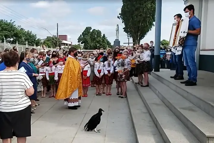 A urubu cumpriu fervorosamente o dever dominical e participou da recepção do ícone de São José. Os fieis ficaram encantados com a presença ilustre do animalzinho que respeitosamente seguiu todos os ritos da celebração.