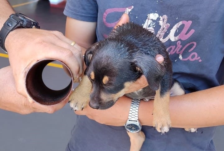 O filhote enroscou a cabeça em um tubo metálico. O tutor não conseguia retirar o cão, por isso foi, desesperado, pedir socorro aos bombeiros.