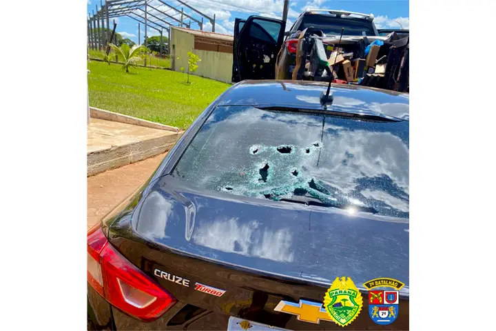 Diante das informações a equipe policial foi até o local, onde encontraram um veículo Fiat/Toro, de cor preta, que continha em seu interior, diversos produtos provenientes do Paraguai (perfumes e armas de airsoft, dentre outros). Verificou-se ainda que este veículo estava alvejado por disparos de arma de fogo.