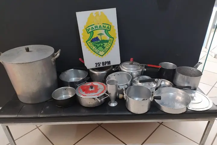 A PM foi informada via 190 que um homem tinha saído de uma residência com um saco contendo várias panelas em alumínio. Ele estava em frente a uma empresa nas proximidades.