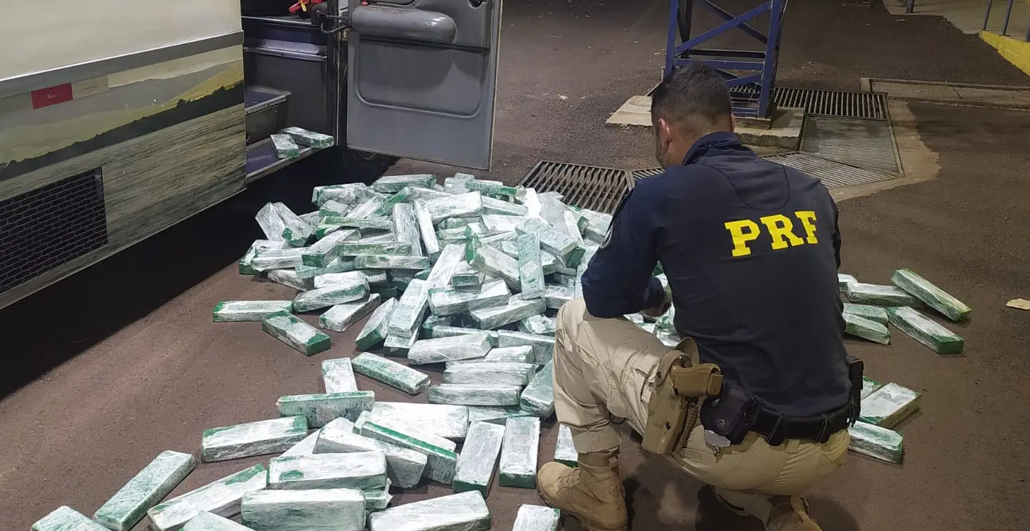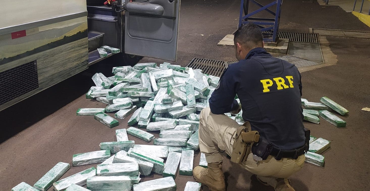 PRF apreende meia tonelada drogas em fundo falso de ônibus e prende uma pessoa