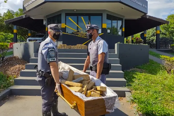 Policiais militares do 2° Batalhão de Polícia Rodoviária do Estado de São Paulo localizaram 119 tabletes de maconha em uma urna funerária durante uma operação na Rodovia Raposo Tavares, SP-270. A situação aconteceu no domingo (12).