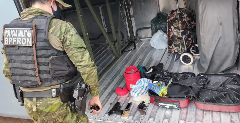 Policiais militares do Batalhão de Polícia de Fronteira (BPFron) patrulhavam a BR-272, em Francisco Alves, durante a Operação Hórus, quando abordaram um ônibus de transporte interestadual. No bagageiro foi encontrada uma mala contendo duas armas sendo uma pistola calibre 9mm com dois carregadores e 20 munições do mesmo calibre, além de um revólver calibre 38.
