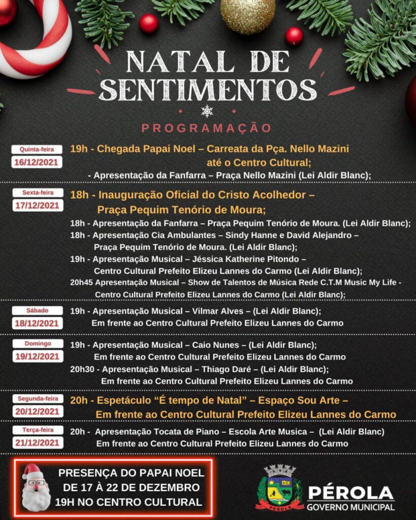 Uma programação toda especial foi preparada pela Prefeitura de Pérola para receber o Papai Noel. O “Natal de Sentimentos “será aberto nesta quinta-feira (16), quando a Prefeita Valdete Cunha irá entregar a chave da cidade para o Bom Velhinho. O evento será no Centro Cultural às 19h e é aberto a toda comunidade.