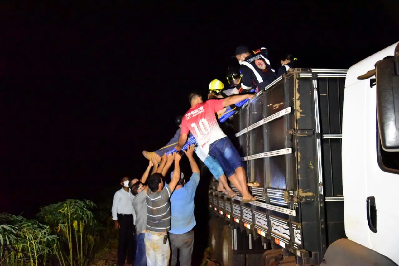 O homem foi levado para o Hospital Norospar, em Umuarama. Ele estava consciente e orientado e apresentava fortes dores no peito, conforme o socorro do Samu. O Corpo de Bombeiros precisou ser acionado para auxiliar na retirada da vítima da carroceria do caminhão.