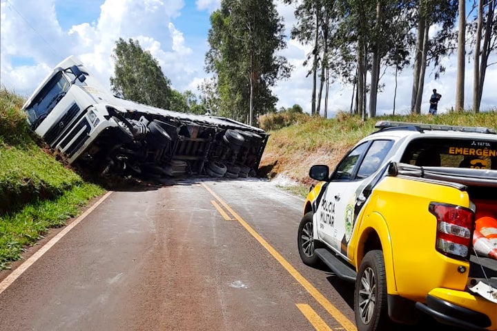 Uma carreta carregada com fécula de mandioca tombou na rodovia PR-158 e a pista ficou interditada. O acidente aconteceu por volta das 11h30 desta sexta-feira (17) na cidade de São João do Caiuá.