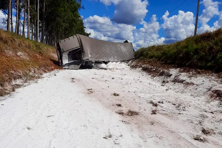 Uma carreta carregada com fécula de mandioca tombou na rodovia PR-158 e a pista ficou interditada. O acidente aconteceu por volta das 11h30 desta sexta-feira (17) na cidade de São João do Caiuá.