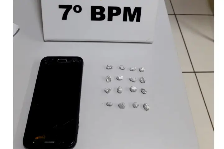 A equipe foi até o endereço e ao verificar a situação, os policiais abordaram o suspeito com as características repassadas na denúncia, o qual foi encontrado consigo um recipiente plástico contendo 16 pedras de crack embaladas para comércio.
