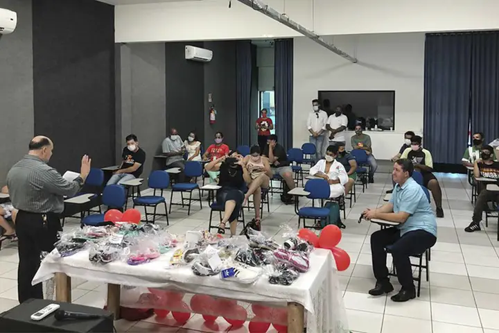 No final da tarde da última sexta-feira (18), foram entregues 400 pares de calçados, 19 camisetas e 25 bonés para representantes de entidades que prestam serviços socioassistenciais.