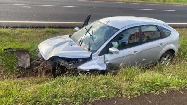 O carro, um Ford Focus prata, acabou caindo no canteiro central da rodovia depois de perder o controle.