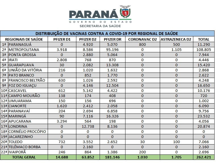 A Secretaria de Estado da Saúde (Sesa) descentralizou nesta terça-feira (21), por via terrestre, 262.421 vacinas contra a Covid-19 para as suas Regionais no Paraná. Os imunizantes são referentes à 73ª pauta do Ministério da Saúde e destinados à dose de reforço (DR), primeira dose (D1) de adolescentes e segunda dose (D2) da população a partir de 12 anos.