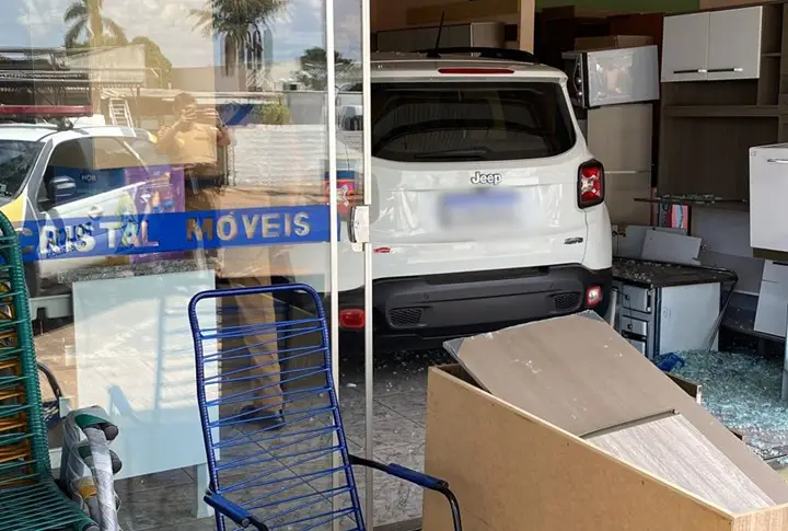 Funcionários de uma loja no centro de Cidade Gaúcha passaram por um grande susto na tarde desta quarta-feira (22). Um veículo Jeep Renegade invadiu a empresa, quebrando a porta de vidro e deixando estrago.