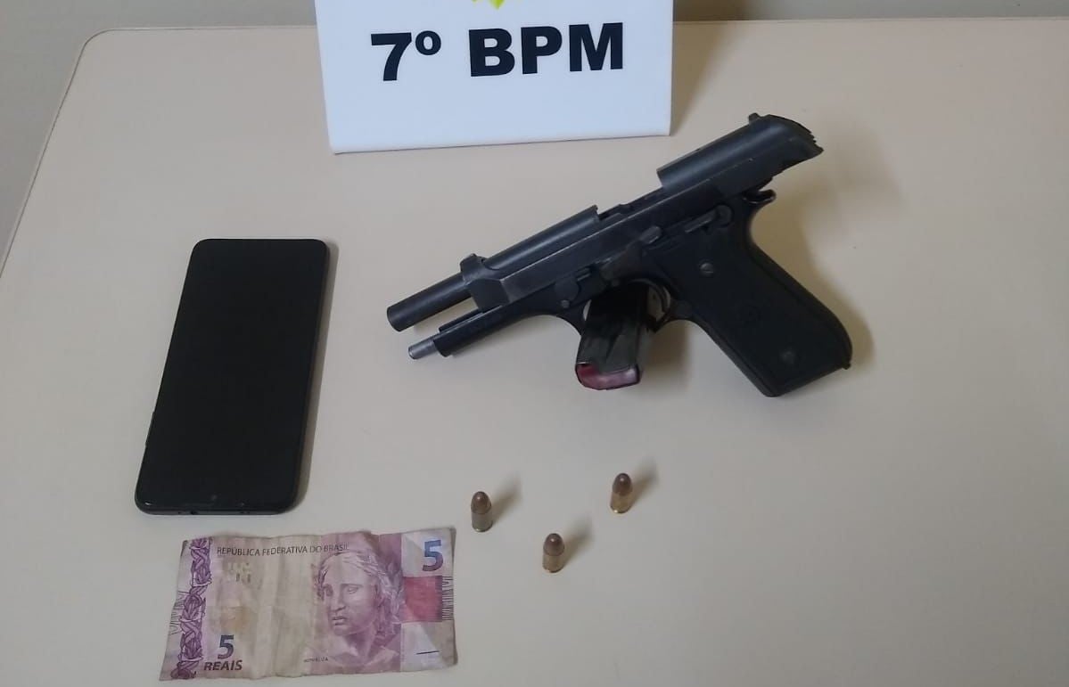 Durante abordagem pessoal nada de ilícito foi encontrado, mas em buscas pelo terreno os militares encontraram sob a vegetação, uma pistola 9mm, com três munições intactas, sendo que, uma estava na câmara de disparo e duas no carregador.