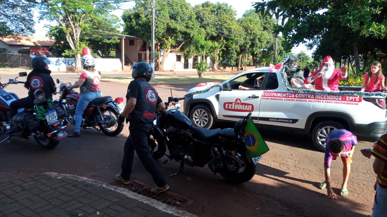 Grupo de motociclistas arrecada doces e Papai Noel faz distribuição para crianças