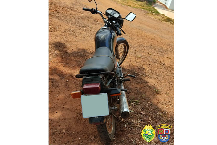 Em revista pessoal, foi encontrado um simulacro de arma de fogo do tipo pistola na cor preta. Ainda, em checagem ao sistema foi constatado que a motocicleta que eles utilizavam possuía alerta de furto do mesmo dia, horas mais cedo.