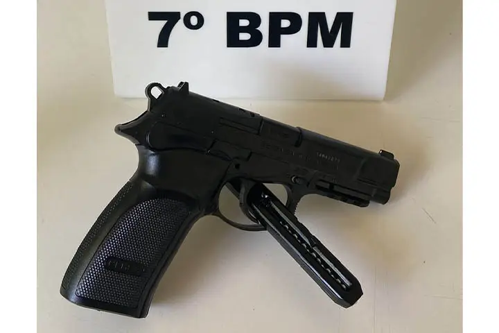 Tratava-se de uma Bersa preta, que não estava com a ponta de cor laranja (que indica que a arma não é de verdade) e carregada com esferas de aço.