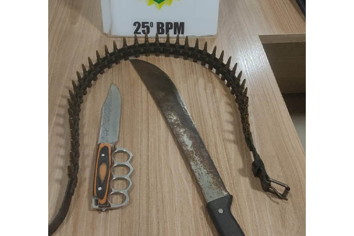 Uma viatura da polícia militar foi até o local e localizou o homem que foi identificado pelas características repassadas pelo denunciante. Os policiais deram voz de abordagem, e ele reagiu, não acatando as ordens policiais e que na iminência da tentativa de fuga, apresentando resistência, foi necessário imobiliza-lo para realizar as buscas pessoais, sendo localizado com ele, uma faca em sua cintura, além de um cinto com réplicas diversas munições de festim de calibre .556, visivelmente alterado e ainda resistindo a abordagem.