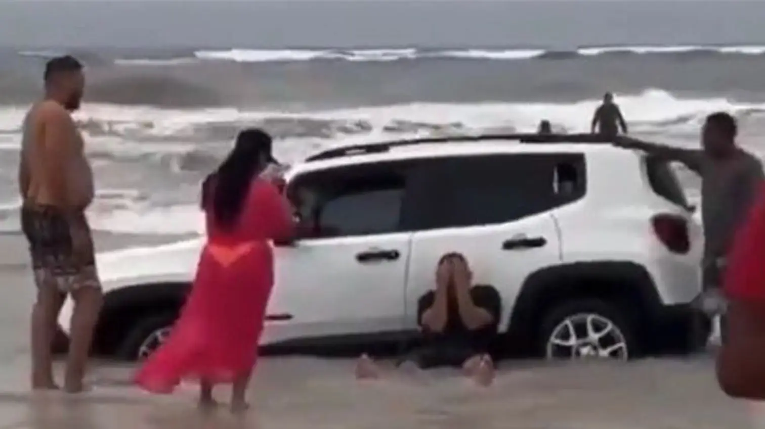 Por causa da chuva a maré subiu e outros carros também ficaram atolados. O vídeo mostra o condutor sentado na areia com as mãos no rosto.