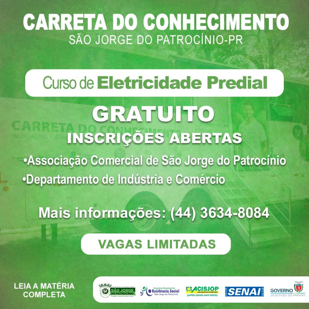 A Prefeitura de São Jorge do Patrocínio, por meio do Departamento de Indústria e Comércio, Secretaria de Assistência Social e Associação Comercial informa que a Carreta do Conhecimento estará no município para a realização do Curso Técnico de Eletricista Predial.