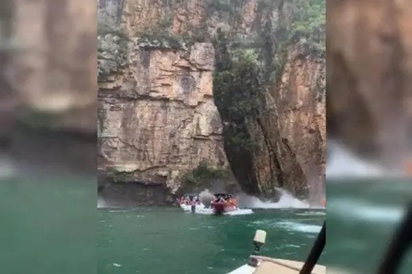 Um vídeo impressionante flagrou o momento em que a pedra se desprende na margem do lago, cai na água e aparentemente chega a atingir as embarcações em uma área turística.
