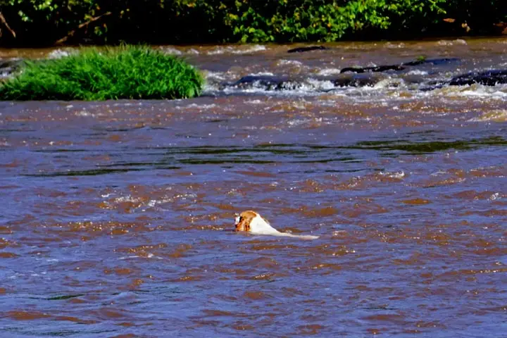 Na imagem flagrada pela fotógrafa Mayara Cristina é possível ver o momento em que o animal é levado pela correnteza e depois ele consegue sair em meio as pedras e o mato. Possivelmente o animalzinho atravessou até o distrito de Paulistania em Alto Piquiri. “Aparentemente estava bem cuidada e gordinha. Parecia ser fêmea”, contou.