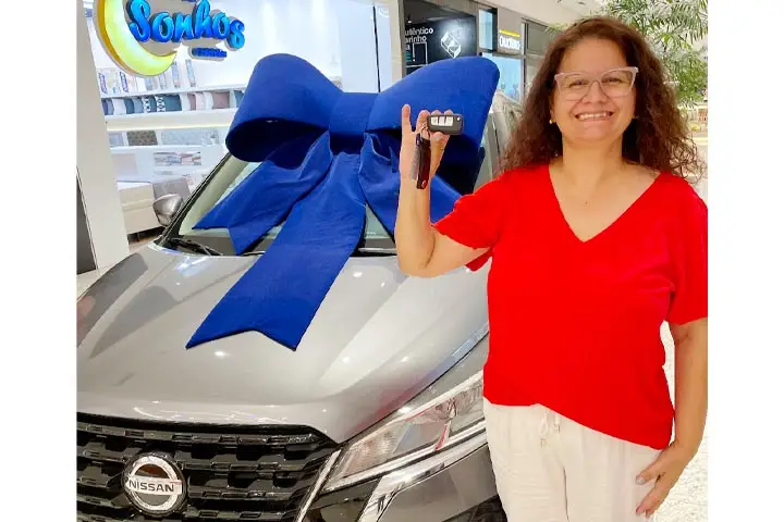 Já a segunda contemplada da noite foi Ezi de Mello Jander, que participou com 11 cupons e ganhou o Nissan Kicks Cinza. Após receber o contato do Palladium, veio correndo para o shopping trazendo toda a família para conferir de perto o presentão de início de ano.