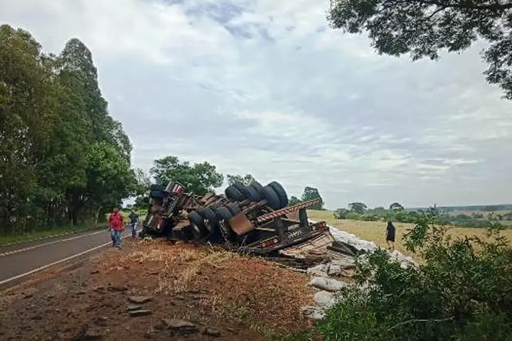 Uma carreta carregada com farelo de soja tombou na rodovia PR-486, no trecho entre Moreira Sales e o distrito de Paraná do Oeste, na manhã desta quinta-feira (13). O condutor não sofreu ferimentos.