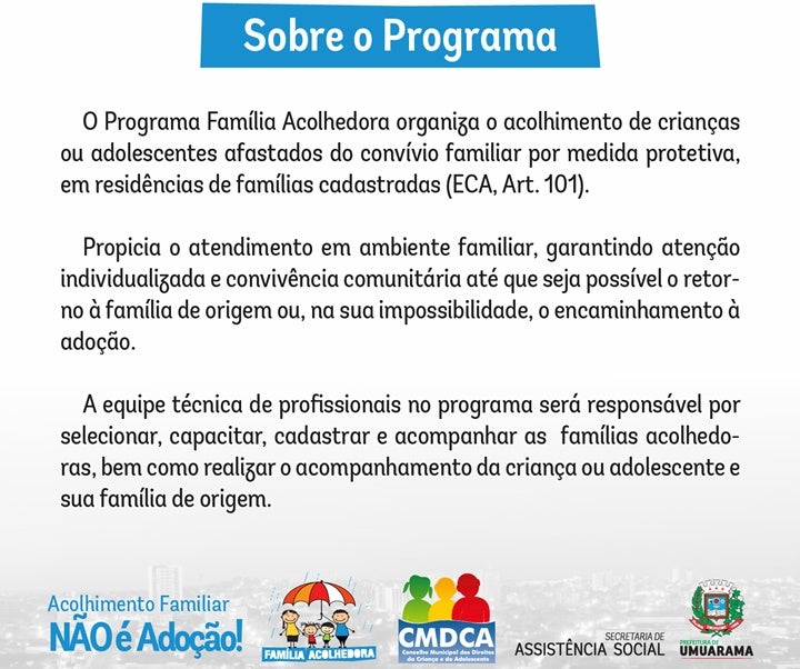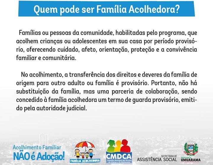 O Programa Família Acolhedora, da Secretaria Municipal de Assistência Social, é respaldado pela Lei Municipal nº 4259/2018.