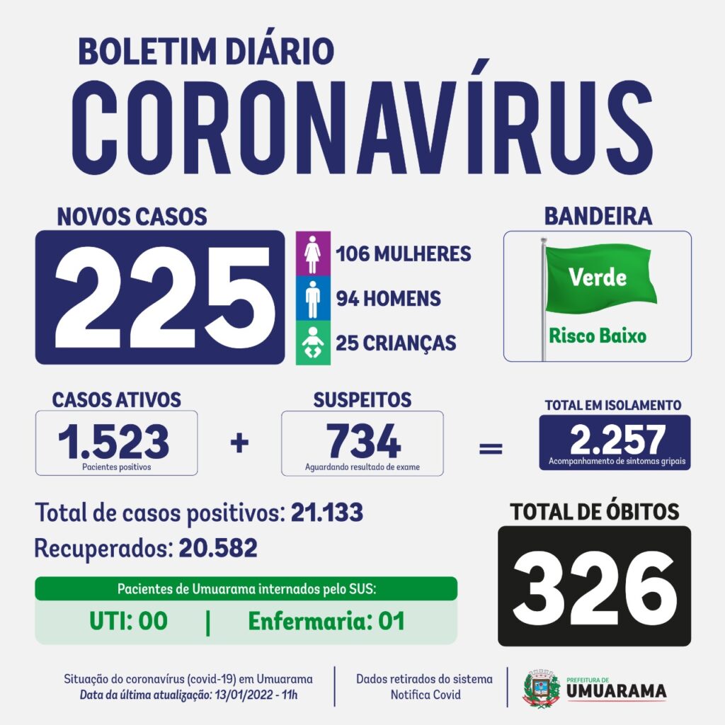 A Secretaria de Saúde de Umuarama, por meio do Boletim Covid, informa que 225 novos casos da doença foram confirmados nesta quinta-feira (13), sendo 106 mulheres, 94 homens e 25 crianças. O número de casos suspeitos caiu de 931 para 734 e o total de ativos aumentou de 1.497 para 1.523.