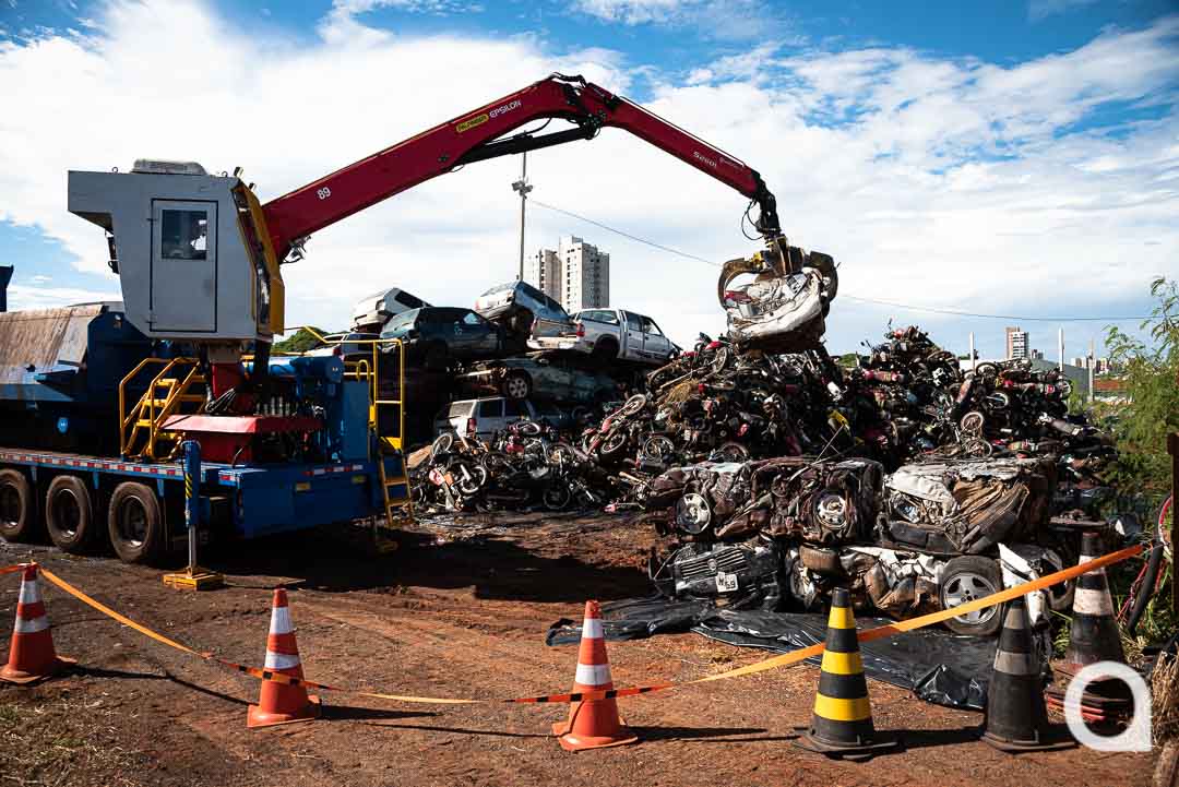 Uma prensa móvel está realizando a destruição de 50 veículos e 400 motocicletas que estão no pátio do 25º Batalhão de Polícia Militar (BPM). Os carros foram comprados por uma empresa recicladora de ferro e aço. Antes do processo de prensa, os veículos passaram por descontaminação, com retira de baterias, combustíveis e óleo lubrificante.