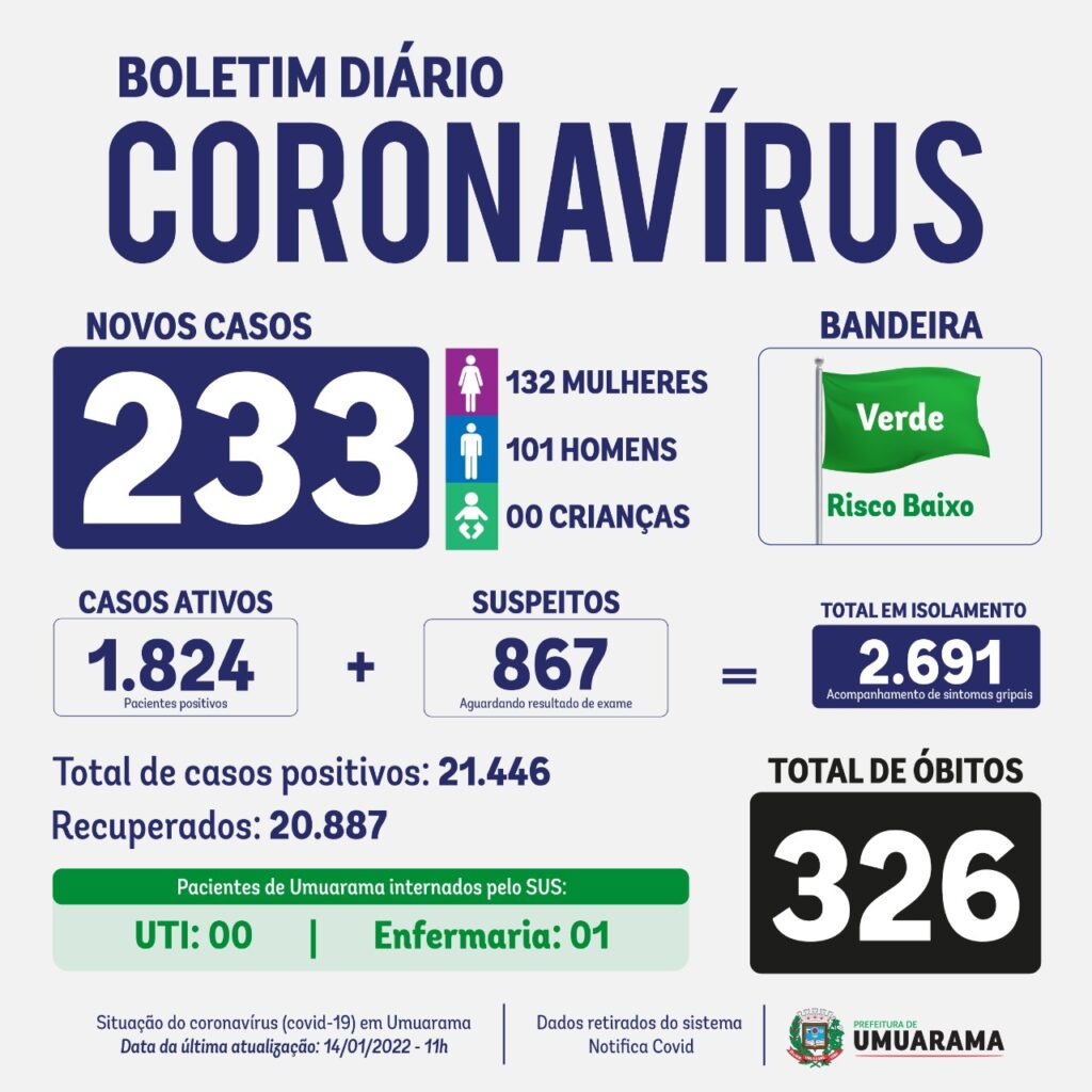 Ainda de acordo com o informativo emitido pela Secretaria Municipal de Saúde, há uma pessoa de Umuarama internada em enfermaria disponibilizada pelo SUS (Sistema Único de Saúde) e nenhuma internada em UTI. O município segue classificado com bandeira verde pela Secretaria de Estado da Saúde (Sesa), que considera o total de internamentos como principal parâmetro para essa designação.
