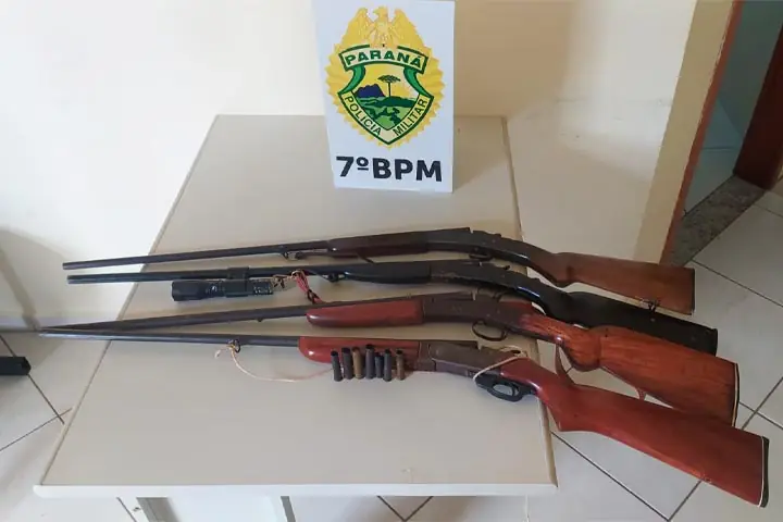 Após diligências, os policiais conseguiram realizar a abordagem ao suspeito de ameaças e com autorização conseguiram entrar na residência e durante as buscas foram encontradas quatro espingardas e diversos cartuchos.