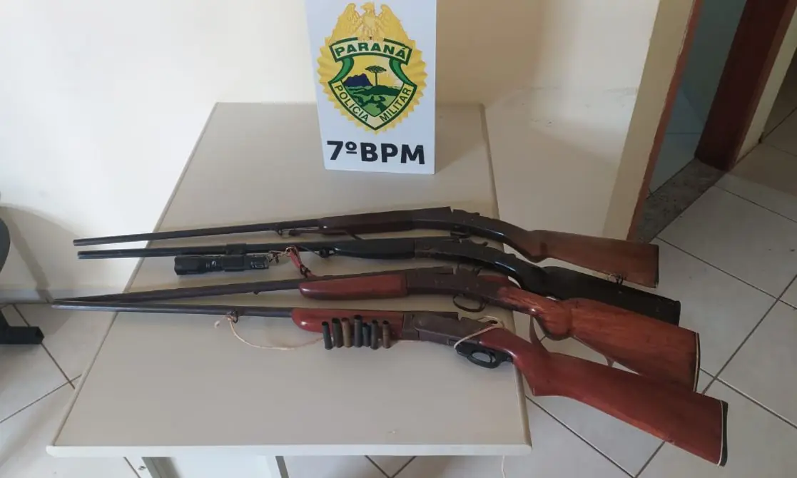Foi feita a abordagem ao autor das ameaças e a revista na residência, na qual foram encontradas quatro espingardas de calibres diferentes e diversos cartuchos.