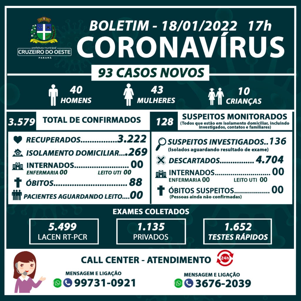 A Secretaria de Saúde de Cruzeiro do Oeste divulgou na tarde de terça-feira (18) o boletim epidemiológico de casos de Covid. No período de 24 horas foram registrados 93 casos positivos da doença.