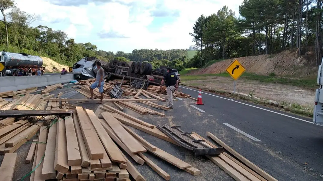 De acordo com a Polícia Rodoviária Federal (PRF), o motorista seguia de Imbaú para Ponta Grossa, nos Campos Gerais, quando perdeu o controle e tombou em uma curva. A carga do caminhão, composta por tábuas de madeira, ficou espalhada na pista, interditando a rodovia sentido Curitiba.